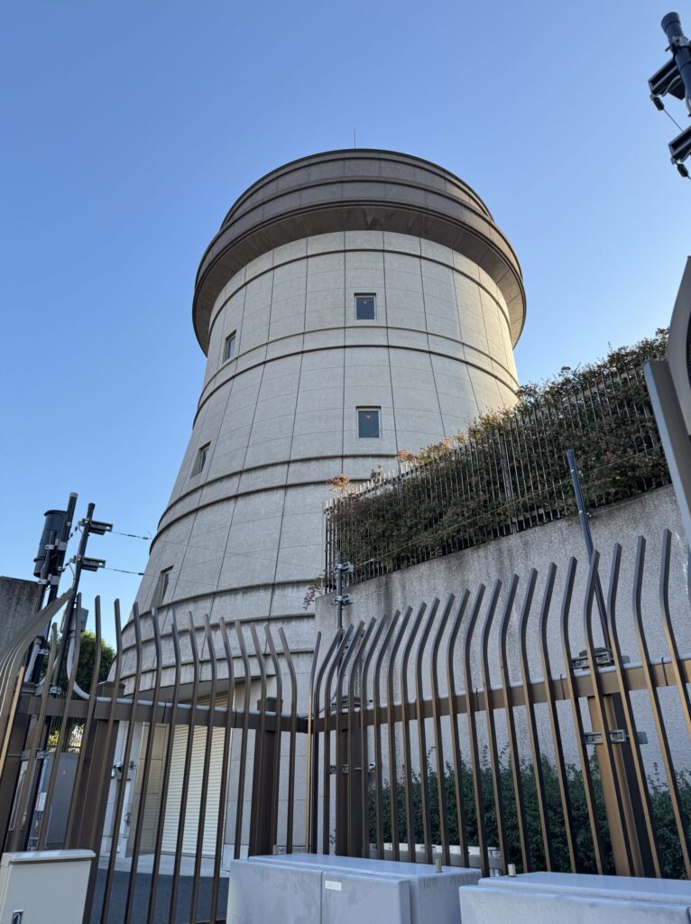道沿いに大谷口給水場ポンプ塔が見えてきたら住宅街に入っていきます。
